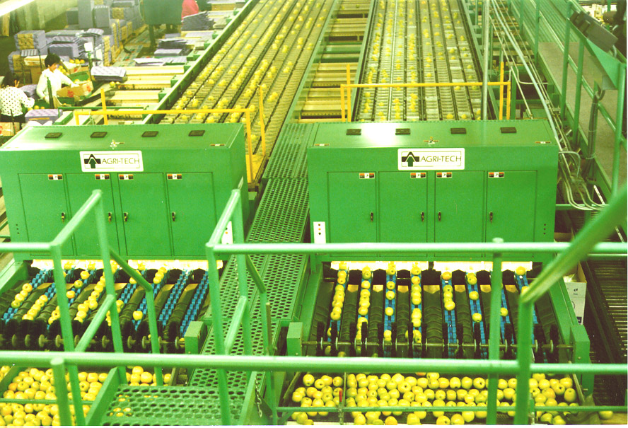 After grading the fruit is transported by a mechanical sorting machine that discharges the fruit at many different locations along it’s length. The “drop” location for each individual fruit is determined by the operator based on it’s assigned grade and where in the packinghouse it is to be packed. When a fruit reaches it’s assigned location it is removed from the sorting machine by some methods. Generally the fruit is carried in a pocket or holder which can hinge down backwards, hinge down to the side, or tilt up to cause the fruit fall out. In some cases an ejector is used to knock the fruit out. It then falls onto a conveyer which carries the fruit to its packing location. The mechanisms for releasing are carefully engineered to minimize damage to the fruit. Typically, soft pads, brushes, and/or ramps are also used to reduce the impact of fruit to each other and to the collection conveyer. The computer controlled sorting machines give the packinghouse the flexibility to sort fruit to meet many different customer requirements. Large apple packing lines sometimes have the capability of separating fruit into 64 or more classes.