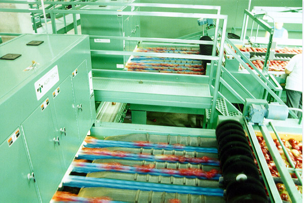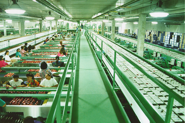After the fruit has gone through the cleaning, coating, and drying process, it is carried to a sorting area for the inspection. Along the sorting conveyer, workers inspect each fruit, remove defective fruit or unwanted items, and redirect different grades of fruit as required. Commonly, a roller conveyer is used to rotate the fruit for overall surface inspection. At this stage workers perform sorting operations that machines are not capable of doing.